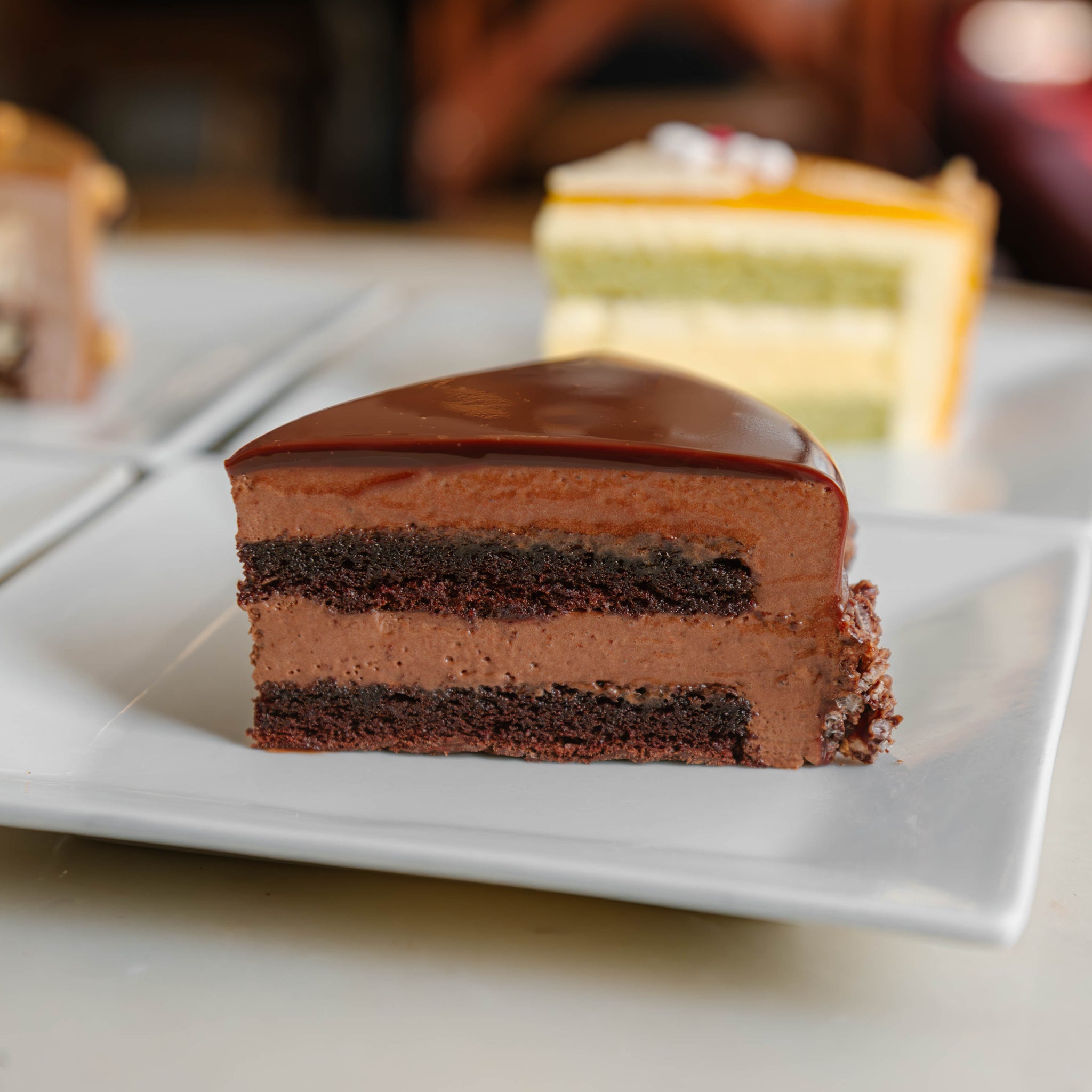 Indulge in Renaud's signature Decadent cake. Dark chocolate mousse, flourless sponge, and dark chocolate glaze create a decadent experience.