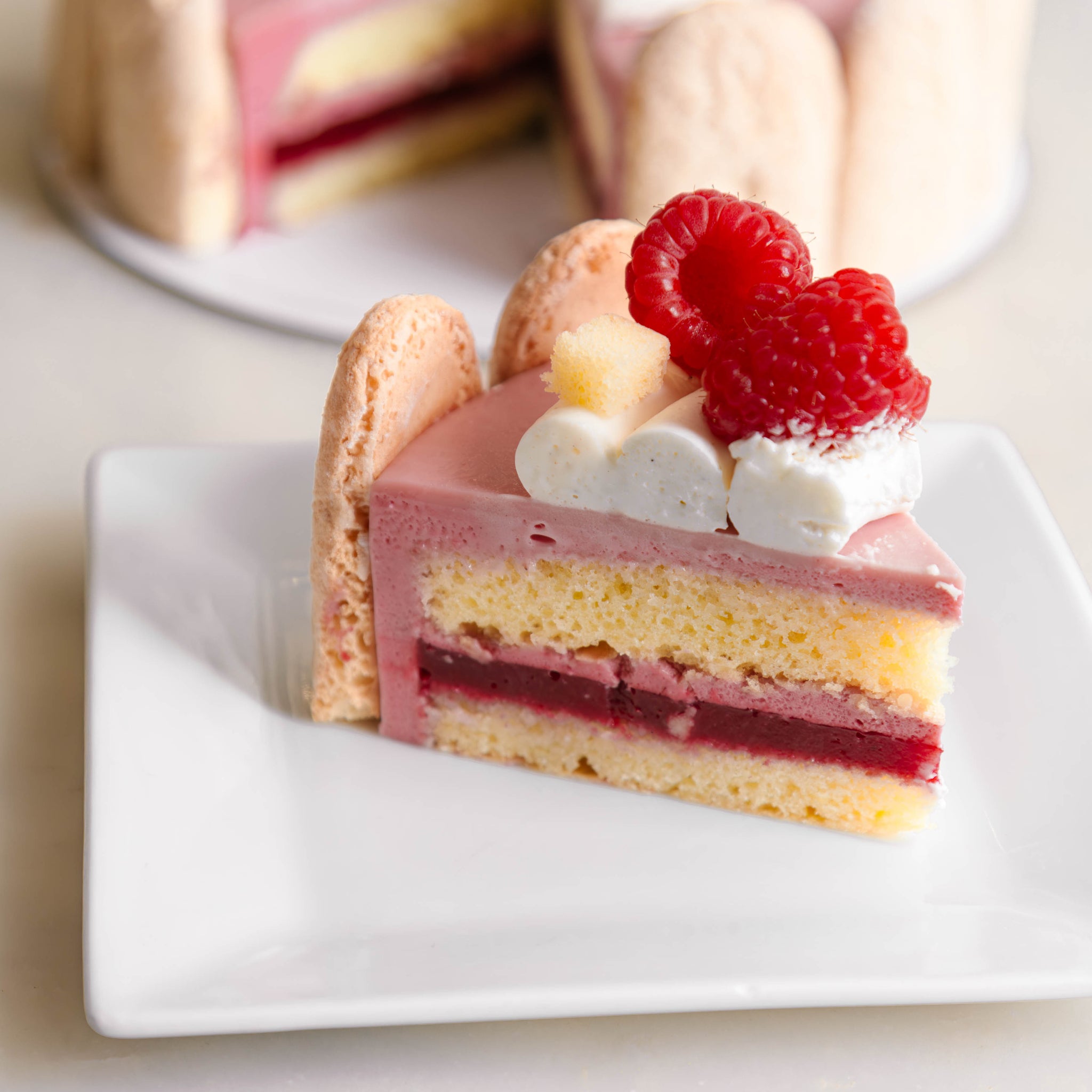 Raspberry mousse, chantilly cream, vanilla bean madeleine sponge, topped with pistachios and fresh raspberries.